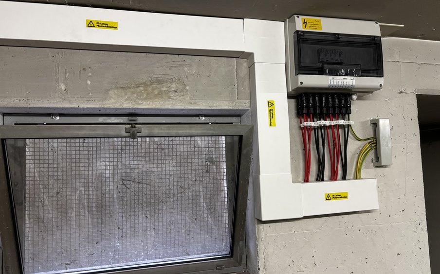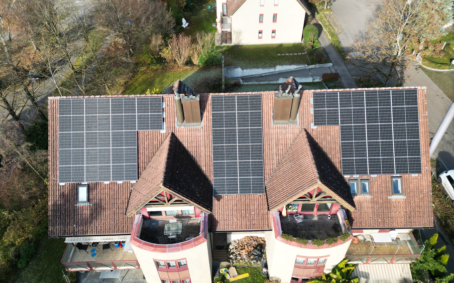 Im Herbst des Folgejahrs erfolgte die Installation einer Photovoltaikanlage (PV-Anlage) auf dem ersten Haus, sowie die Installation einer Ladeinfrastruktur für Elektrofahrzeuge in der gemeinsamen Tiefgarage. Die Omneo AG übernahm dabei die Planung, das Engineering und die Baubegleitung. Die ganze Installation und Montage der PV-Anlage und der Ladeinfrastruktur wurde die 3E Elektro AG durchgeführt. Beide Dachflächen wurden von unseren Monteuren mit PV-Modulen belegt, um eine Stromproduktion über den ganzen Tag verteilt zu ermöglichen. Die Anbindung in den Keller erfolgte über eine elegante Lösung über ein fassadenmontiertes Stahlrohr.