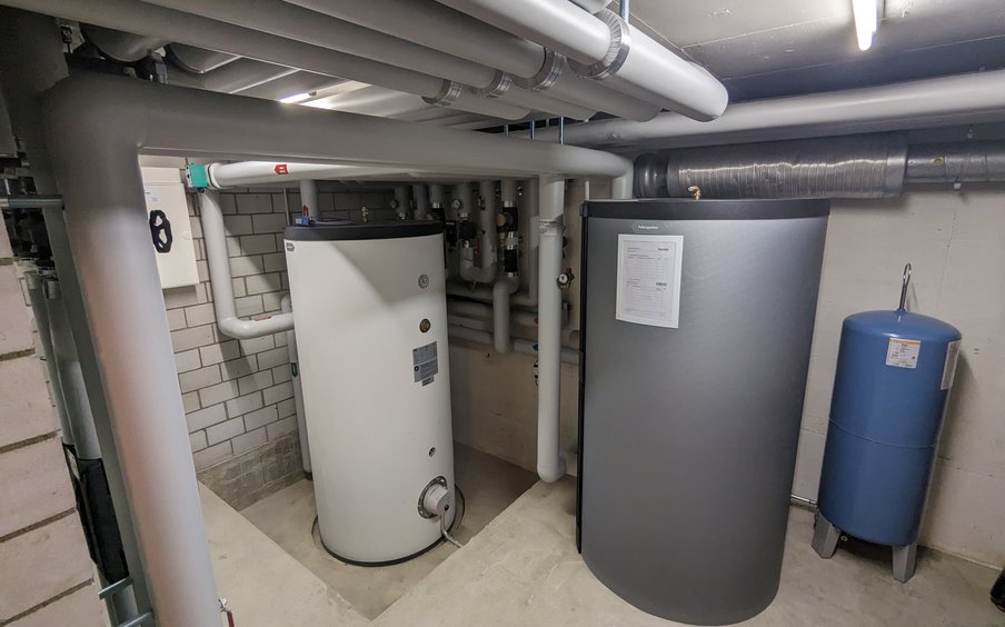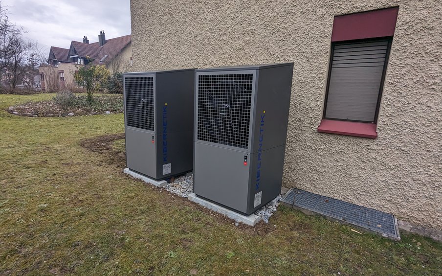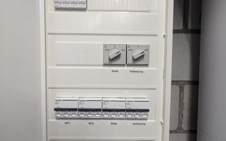 Als ersten Schritt wurde die Ölheizung durch dezentrale Luft/Wasser-Wärmepumpen ersetzt. Im Auftrag der Schwesterfirmen Omneo AG und Hauser & Schwerzmann Haustechnik AG, welche den Heizungsersatz realisierten, führte das 3E Elektro Team den elektrischen Anschluss der Wärmepumpen durch. Es wurden 4 Luft/Wasser-Wärmepumpen (2 pro Haus) der Firma Kibernetik angeschlossen. Gleichzeitig wurde eine zusätzliche Unterverteilung für die Heizung inklusive Anschlüsse der Geräte über Kanäle installiert. Besonders hervorzuheben ist dabei die kompakte Installation, die aufgrund des begrenzten Platzes erforderlich war. Mit einer intelligenten Sim-Karten-Routerlösung wurden Internetanbindungen der Wärmepumpen geschaffen für einen schnelleren und effizienteren Service bei allfälligen Störungen und Wartungsarbeiten.
